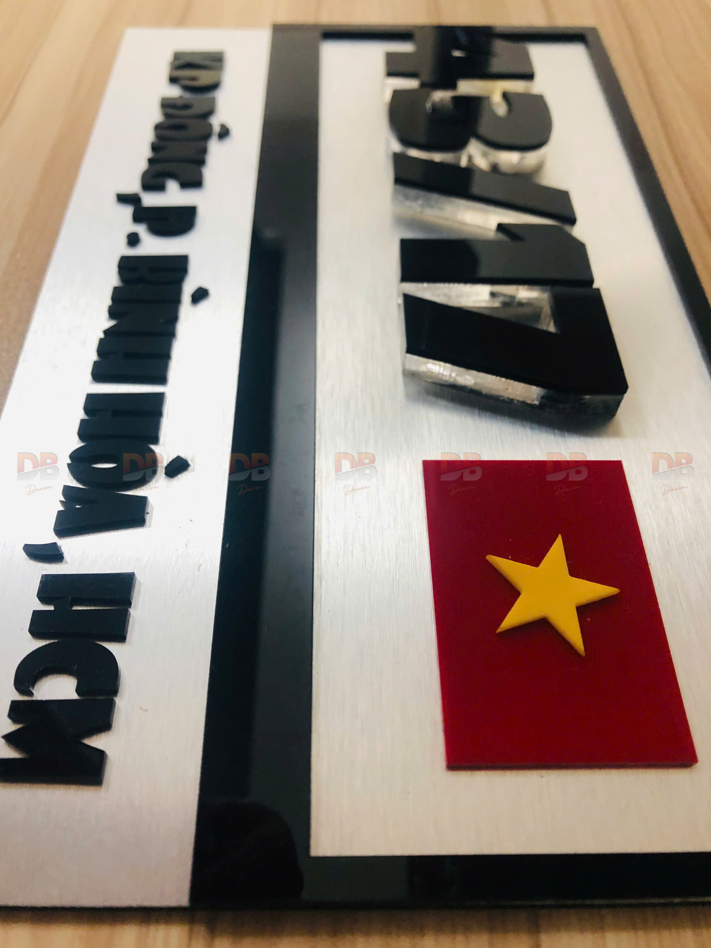 - Chữ nổi 3D: mica đen dày 2.5 mm, dán nổi trên nền, tạo chiều sâu mạnh và cảm giác cao cấp.